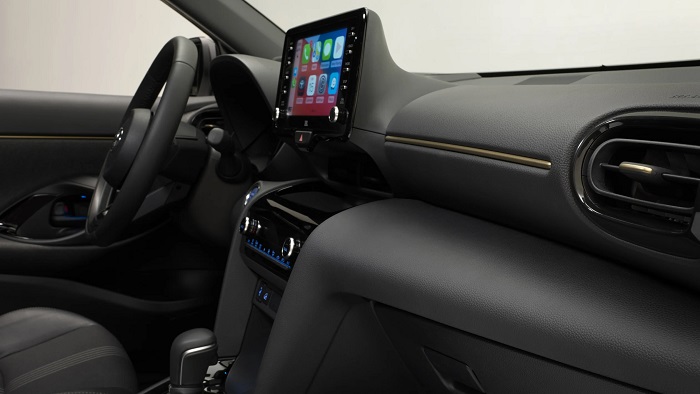 فضای داخلی Yaris Cross با جدیدترین هاچ بک Yaris با یک صفحه نمایش بزرگ لمسی سرگرمی و سرگرمی که روی داشبورد نصب شده است ، دارای قابلیت اتصال Apple CarPlay و Android Auto است. همچنین یک تنظیم سنتی شماره گیری آنالوگ به همراه نمایشگر دیجیتال هدآپ نیز وجود دارد.