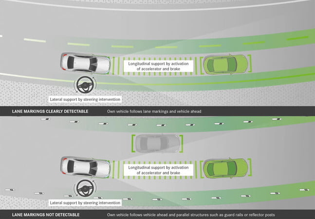مرسدس سیستم کمکی برای نگهداری از خط را ارائه می دهد که با چرخاندن چرخ های منفرد یک ماشین را دوباره به لاین خود می اندازد. اما این خودروساز آلمانی همچنین دارای یک سیستم کمکی فرمان است که می تواند از طریق ورودی های فرمان اتومبیل را در لاین خود متمرکز نگه دارد. این سیستم با سرعت حداکثر 124 مایل در ساعت ، در دو قسمت مستقیم جاده و پیچ های ملایم کار می کند. در درجه اول به نشانه گذاری خط متکی است ، اما همچنین می تواند وسیله نقلیه مقابل خود را "دنبال" کند. در صورت حرکت راننده در حالی که اتومبیل دیگری در نقطه نابینایی خود قرار دارد ، سیستم نظارت بر نقاط کور در برخی از مدل های مرسدس نیز سعی می کند ماشین را به داخل خط خود هدایت کند.